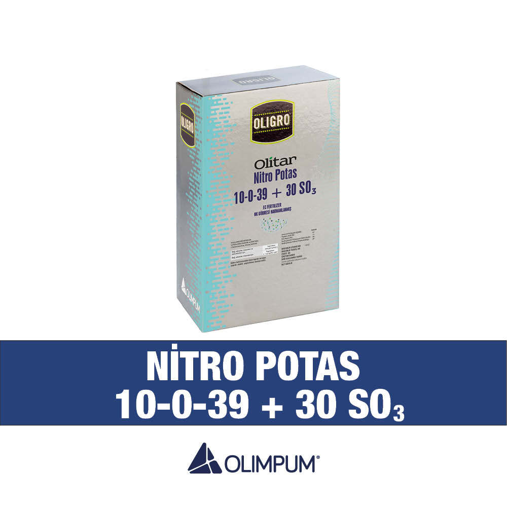 Olitar Nitro Potas 10-0-39 + 30 SO₃ is a water-soluble NK + sulfur fertilizer containing 10% nitrogen (N), 39% potassium oxide (K₂O), and 30% sulfur trioxide (SO₃). Therefore, it provides nitrogen, potassium and sulfur support within a single product. In addition, its soluble structure makes it suitable for both drip irrigation and foliar applications.